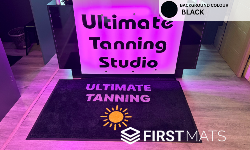 This custom logo mat for Ultimate Tanning Studio brings a polished and professional look to the entrance area. Showcasing the studio’s branding with style, it sets the tone for a high-quality experience inside, welcoming clients with a touch of glamour and reinforcing the studio’s commitment to beauty and confidence.