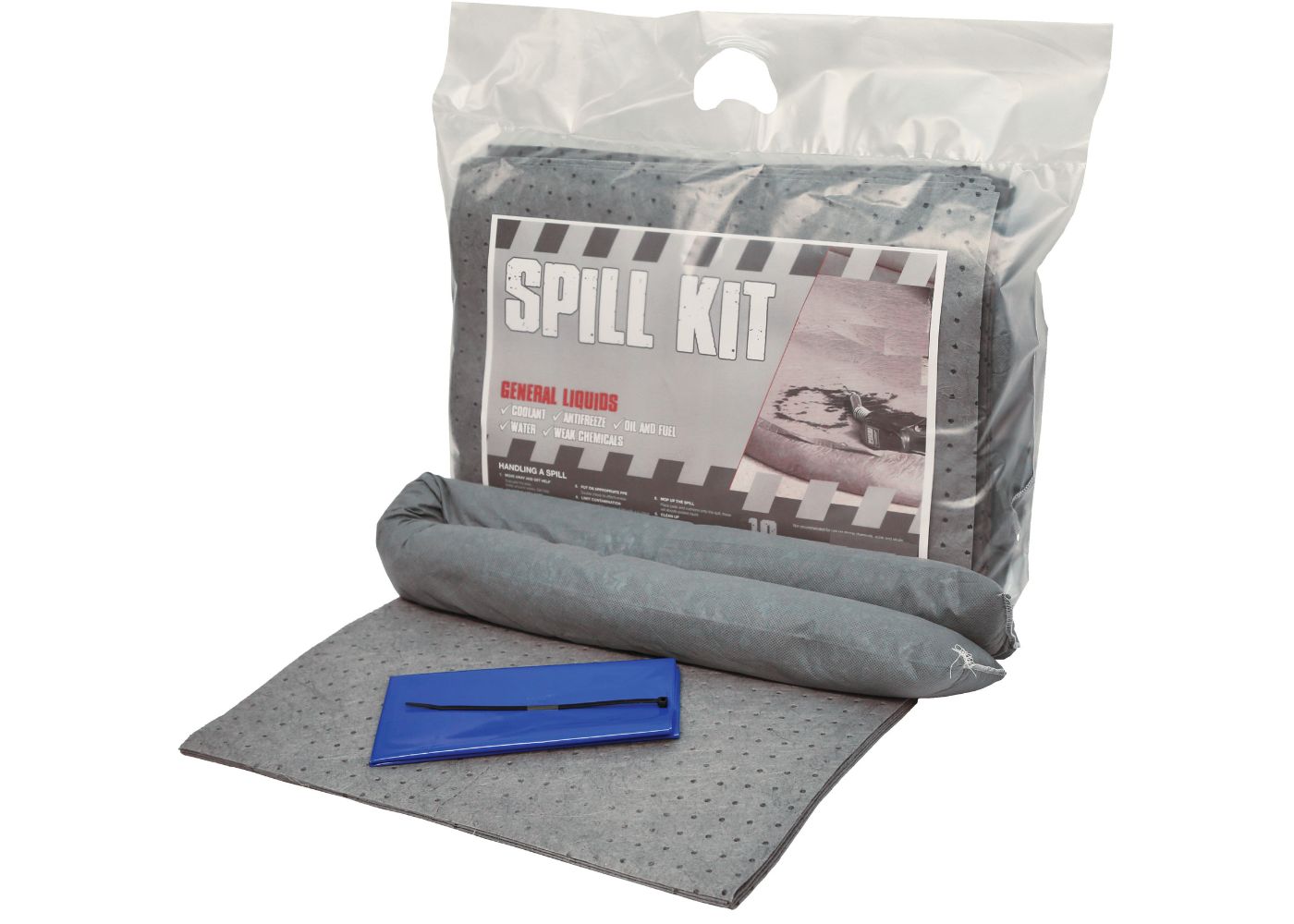 - 10 Litre Mini Universal Spill Kit: This compact kit is designed to swiftly and effectively address minor spills of oil, fuel, and water-based liquids.