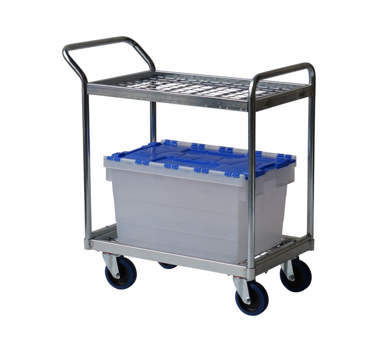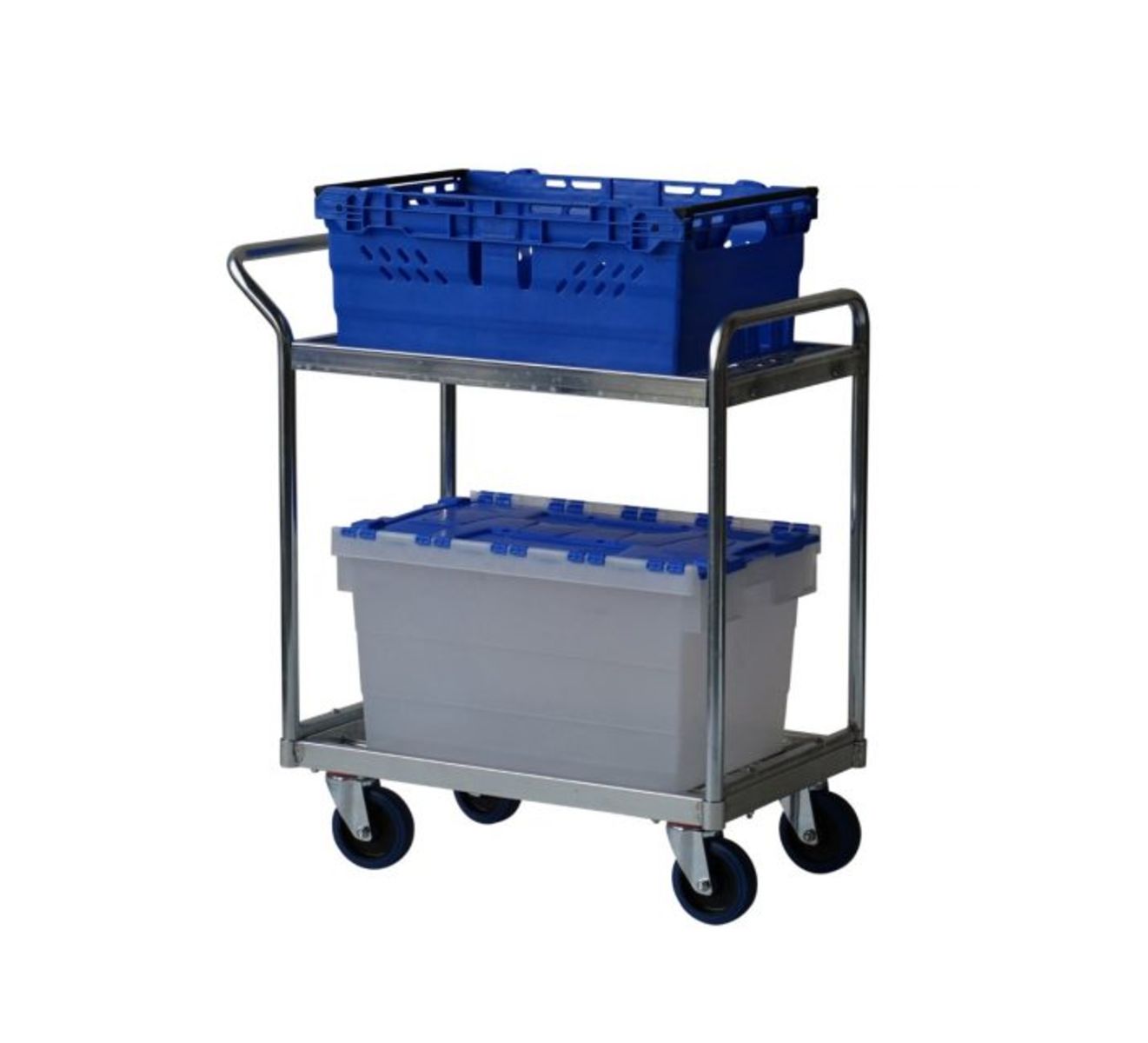 A two-tier stock-picking trolley designed for smooth and secure transport.