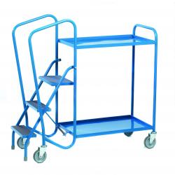 A 2-tier warehouse trolley with integrated steps for secure and convenient stock handling.