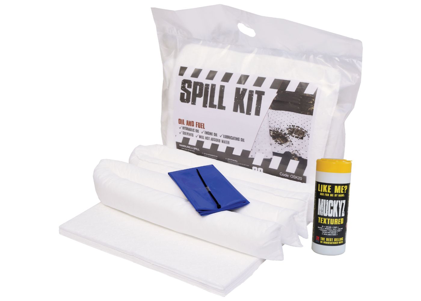 Each kit contains everything required to clean up spills of up to 20 litres, including 10 high-performance absorbent pads, 2 absorbent socks, and a disposal bag for safe waste handling. Supplied with a handy tub of Muckyz 50 wipes, this kit ensures workers can also clean hands and surfaces after dealing with a spill. Suitable for industrial, automotive, and transport use, it offers a reliable way to stay prepared wherever spills may occur.