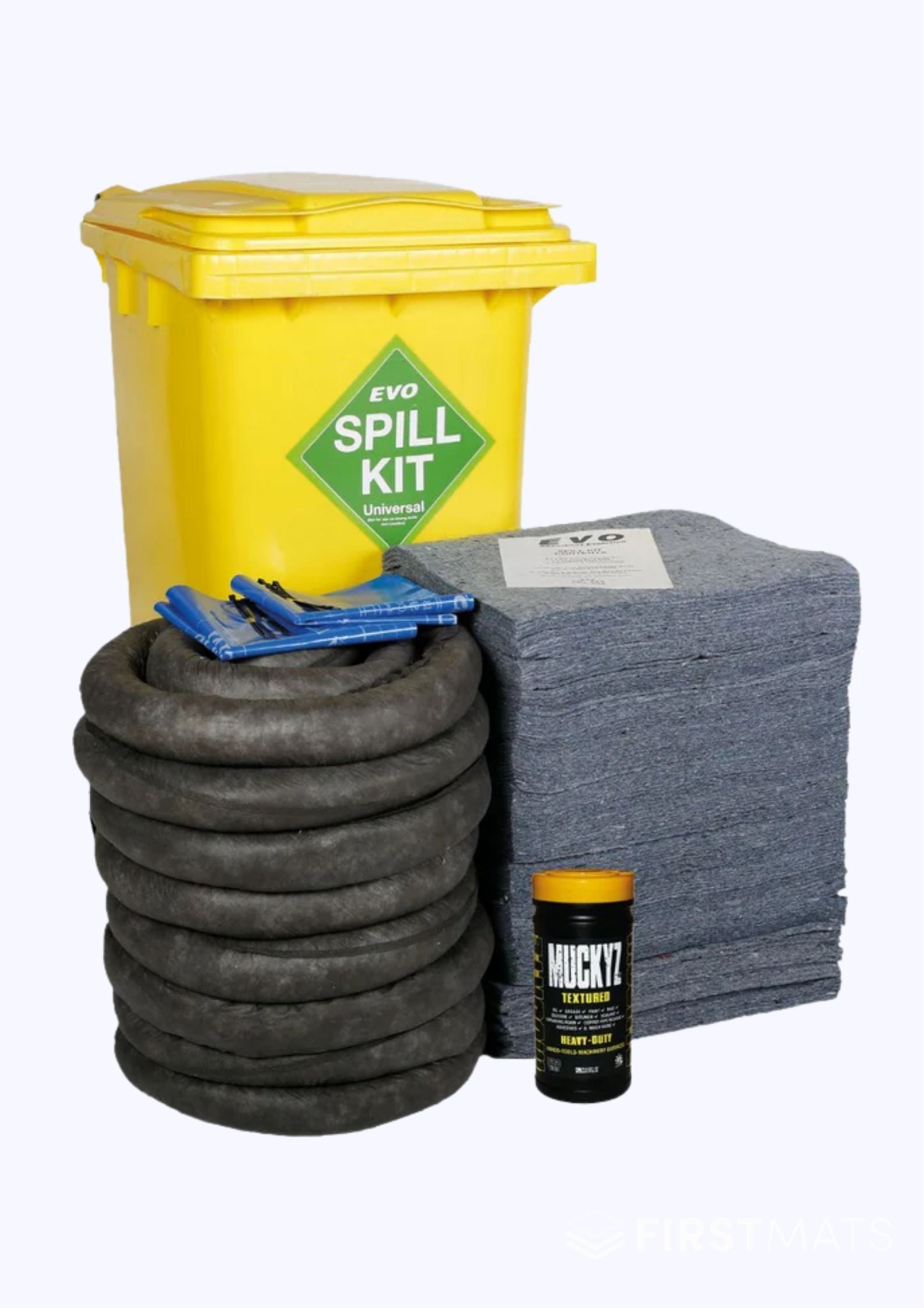 The 240 Litre Universal Evo Spill Kit is an environmentally friendly and highly effective solution for containing oil, coolant, and other non-hazardous spills. Made in the UK from recycled materials, this kit features superior absorbency, holding 25% more than standard polypropylene equivalents. Supplied with pads, socks, disposal bags, and Muckyz wipes, it offers a complete spill management system.