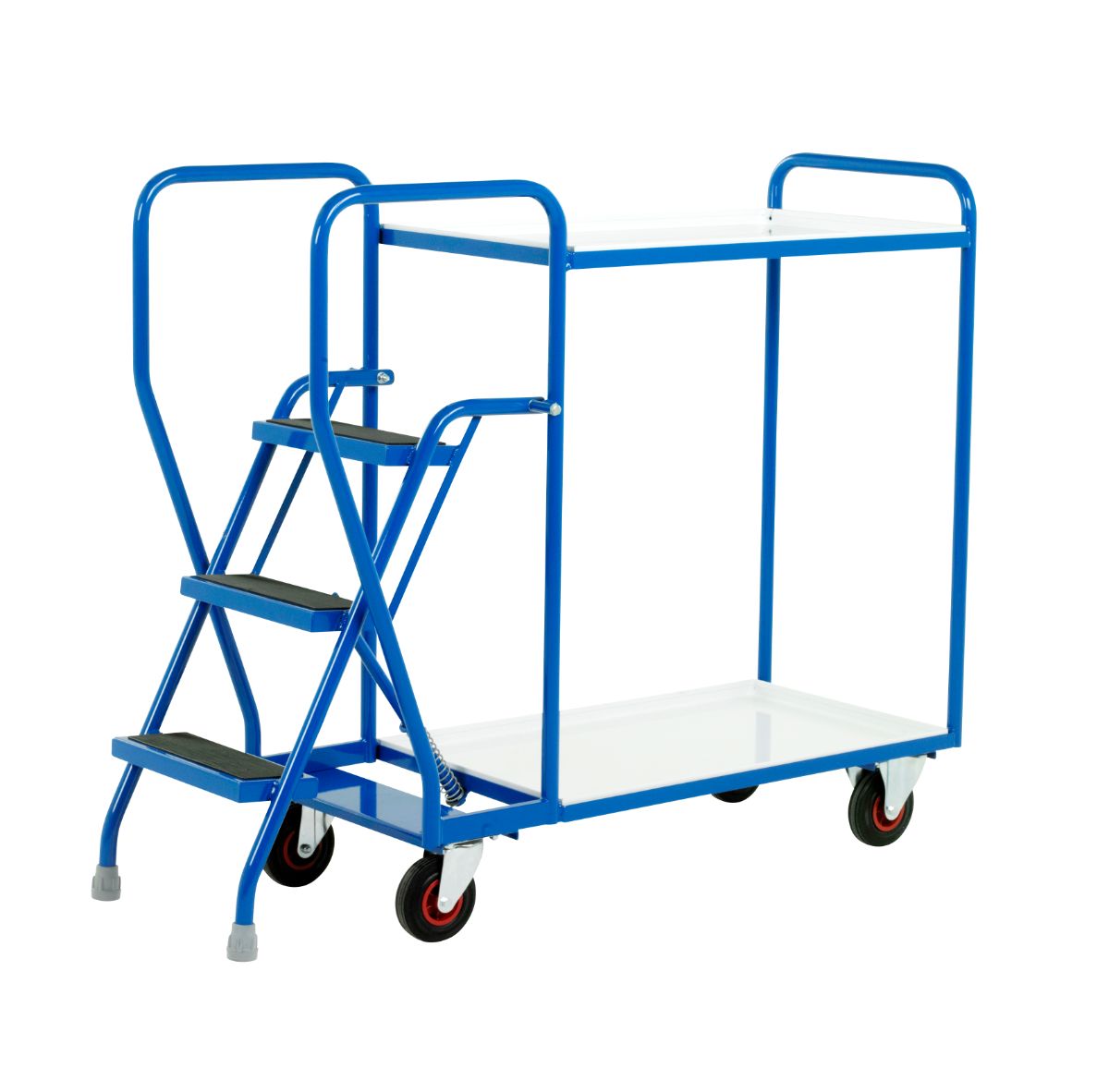 - 3 Step Warehouse Picking Trolley - Reversible White Shelves: This robust, British-made trolley is a combination of a step ladder and shelf trolley, designed to enhance efficiency in picking and storing items from multiple shelves in a single trip.