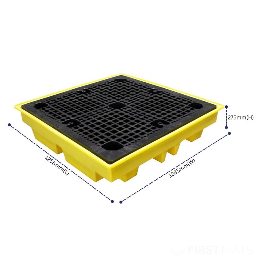 - Compact Dimensions: Measuring 1280(L) x 1285(W) x 275(H) mm, this spill pallet is compact enough for easy storage and navigation, while still offering ample storage space.