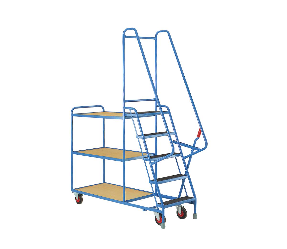 - 5 Step Warehouse Picking Trolley - Plywood Shelves: This robust, British-made trolley combines the functionality of a step ladder and a shelf trolley, enabling operators to pick and store items from multiple shelves in one trip.
