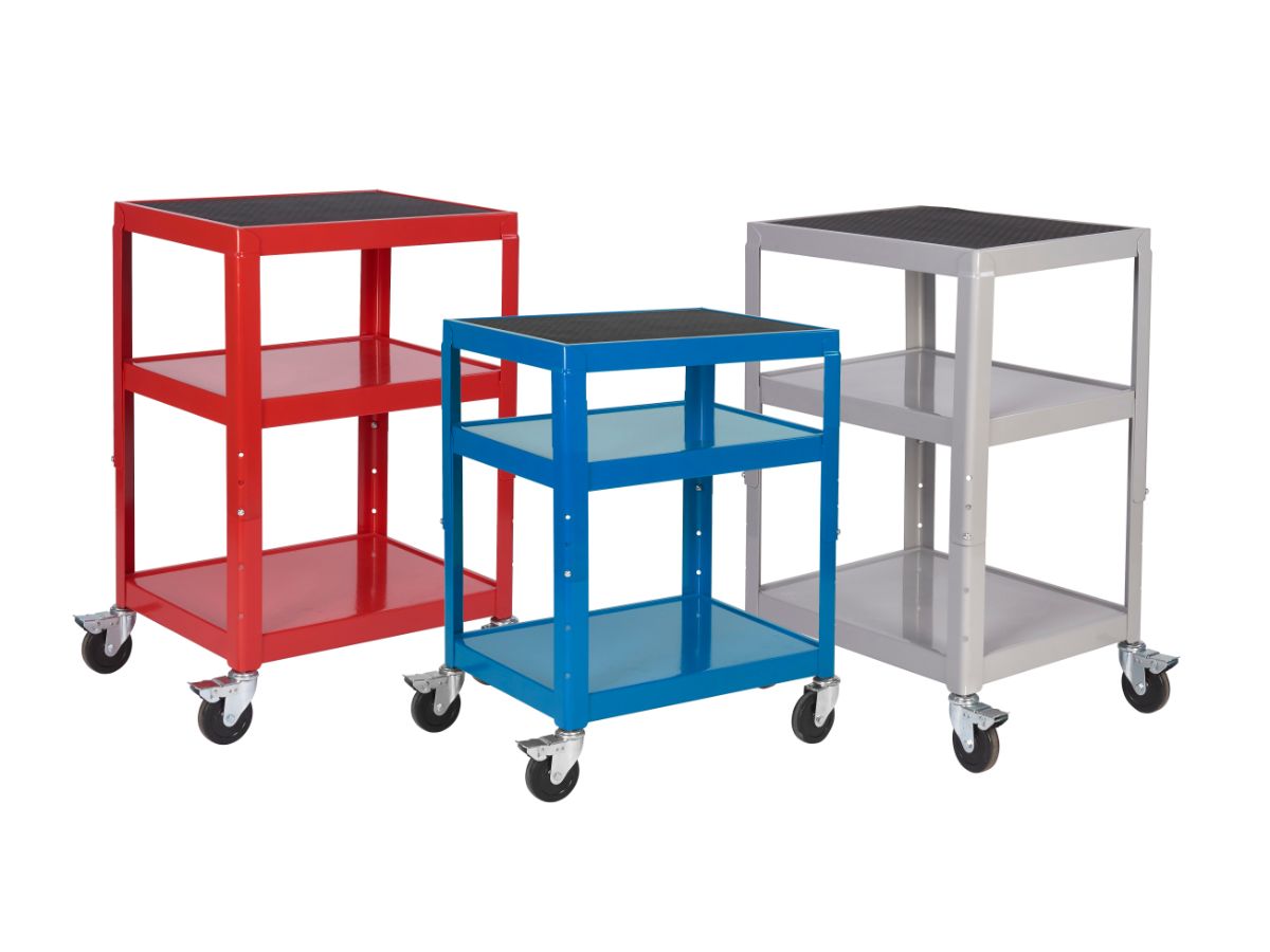 - Adjustable Height Shelf Trolleys - 150kg: A robust, versatile, and space-saving solution for your workplace. This 3-tiered unit is perfect for storing and transporting goods around your business. Available in three distinct colours, it's ideal for colour coordinating company departments and is suitable for kitchens, offices, and workshops.