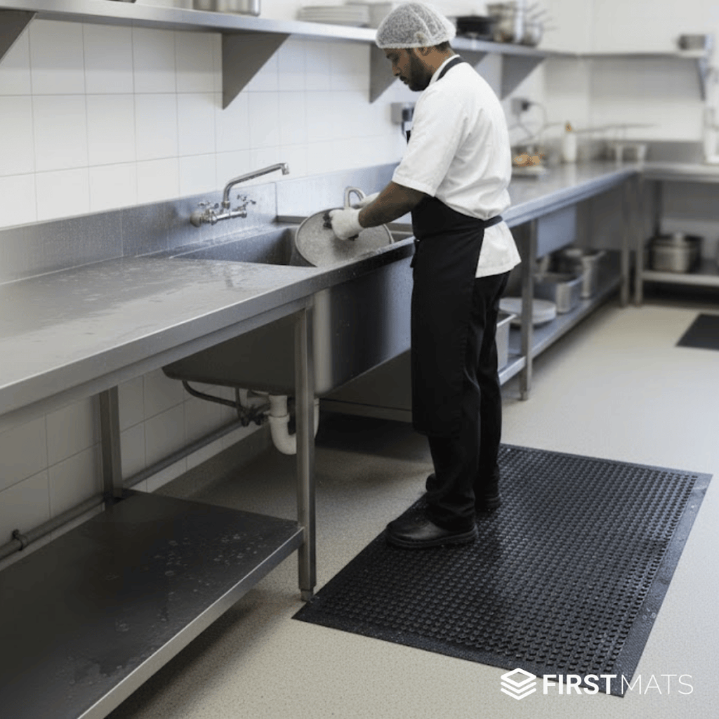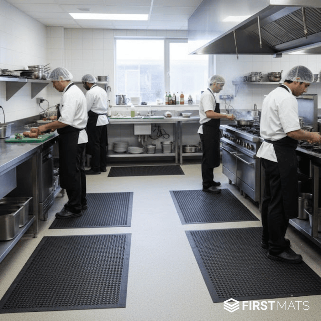 Sizes - At just 5mm in thickness, this mat can be used in kitchens without increasing the risk of trip hazards. It can be purchased in sizes from 60cm x 90cm for individual workstations to large 113cm x 300cm runners for larger areas.