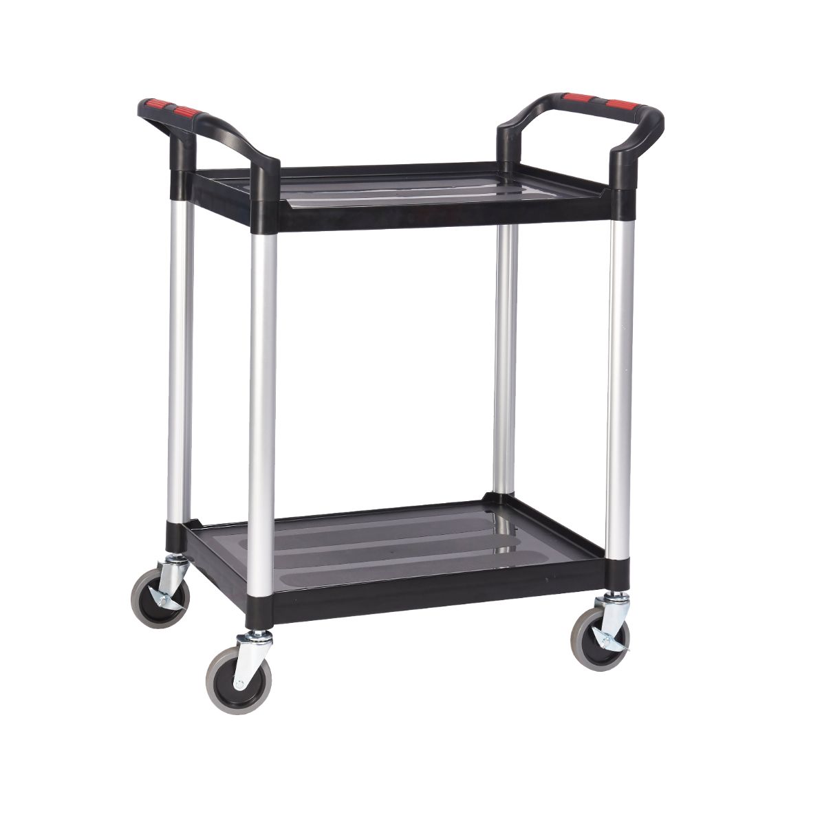 This shelf trolley is constructed from hard-wearing black plastic with sturdy grey aluminium uprights for durability. The two-tiered design provides ample space for storing and transporting goods, while four swivel castors allow smooth movement. Two of the castors are braked for extra control, and large ergonomic handles make manoeuvring easy. Available in two sizes, it is perfect for professional and commercial use.