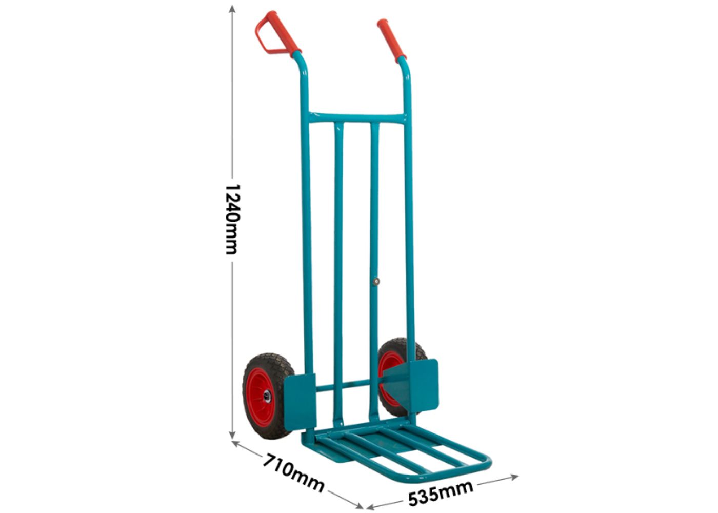 - Dimensions: Measuring 535mm (W) x 710mm (D) x 1240mm (H), this sack truck is compact enough for easy storage and navigation, while still offering ample space for transporting large items.