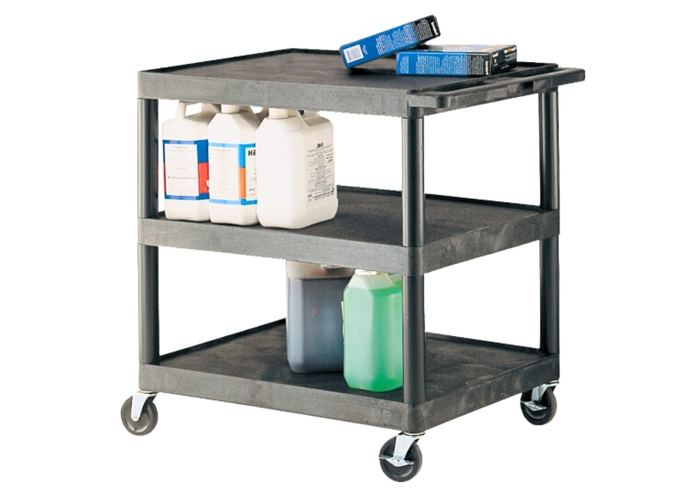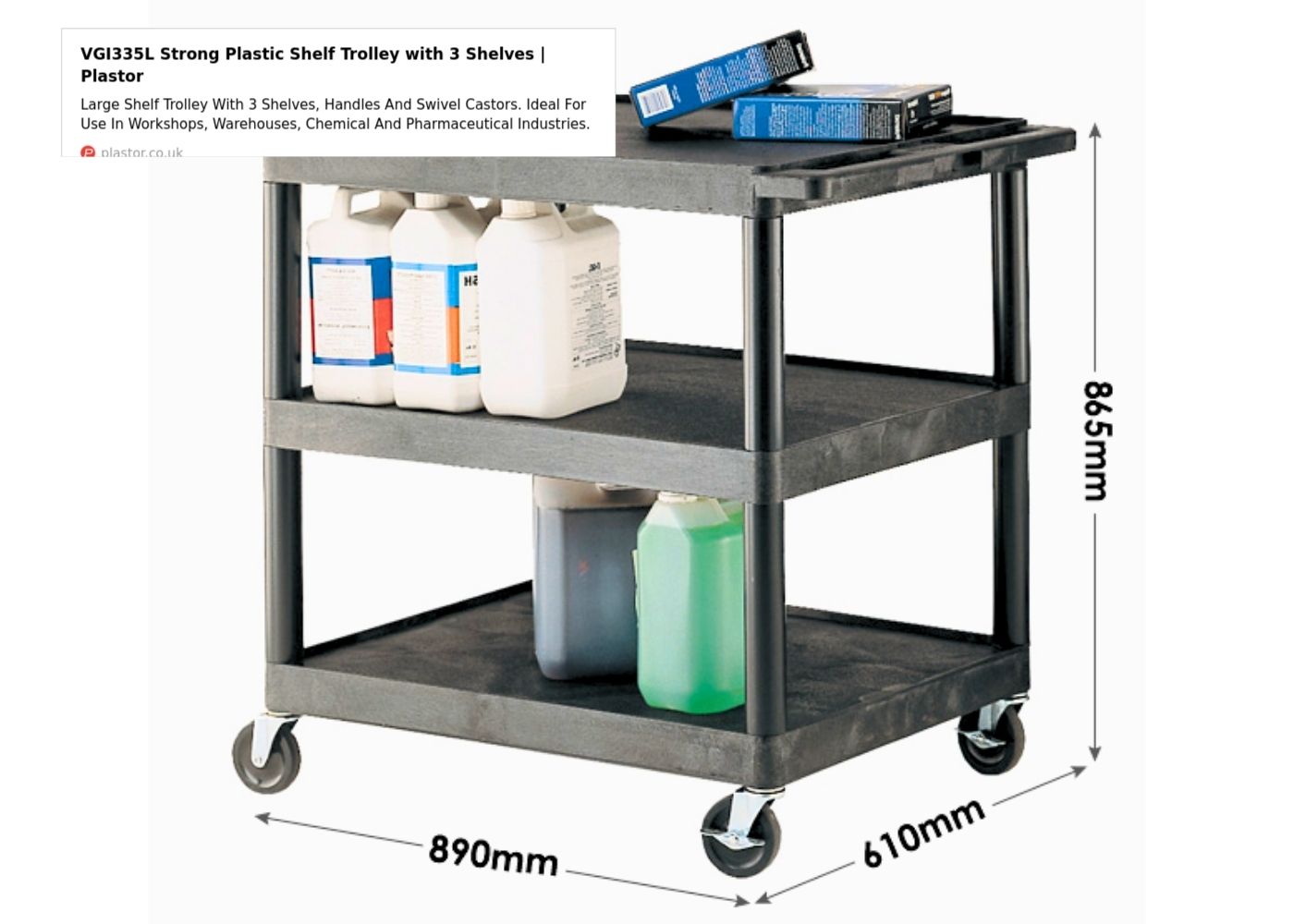 - General Purpose Plastic 2 Tier Shelf Service Trolley: This robust polyethylene trolley is a versatile choice for transporting items around your workplace, ideal for workshops, storerooms, warehouses, and even chemical and pharmaceutical industries.