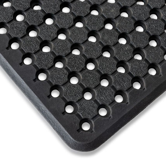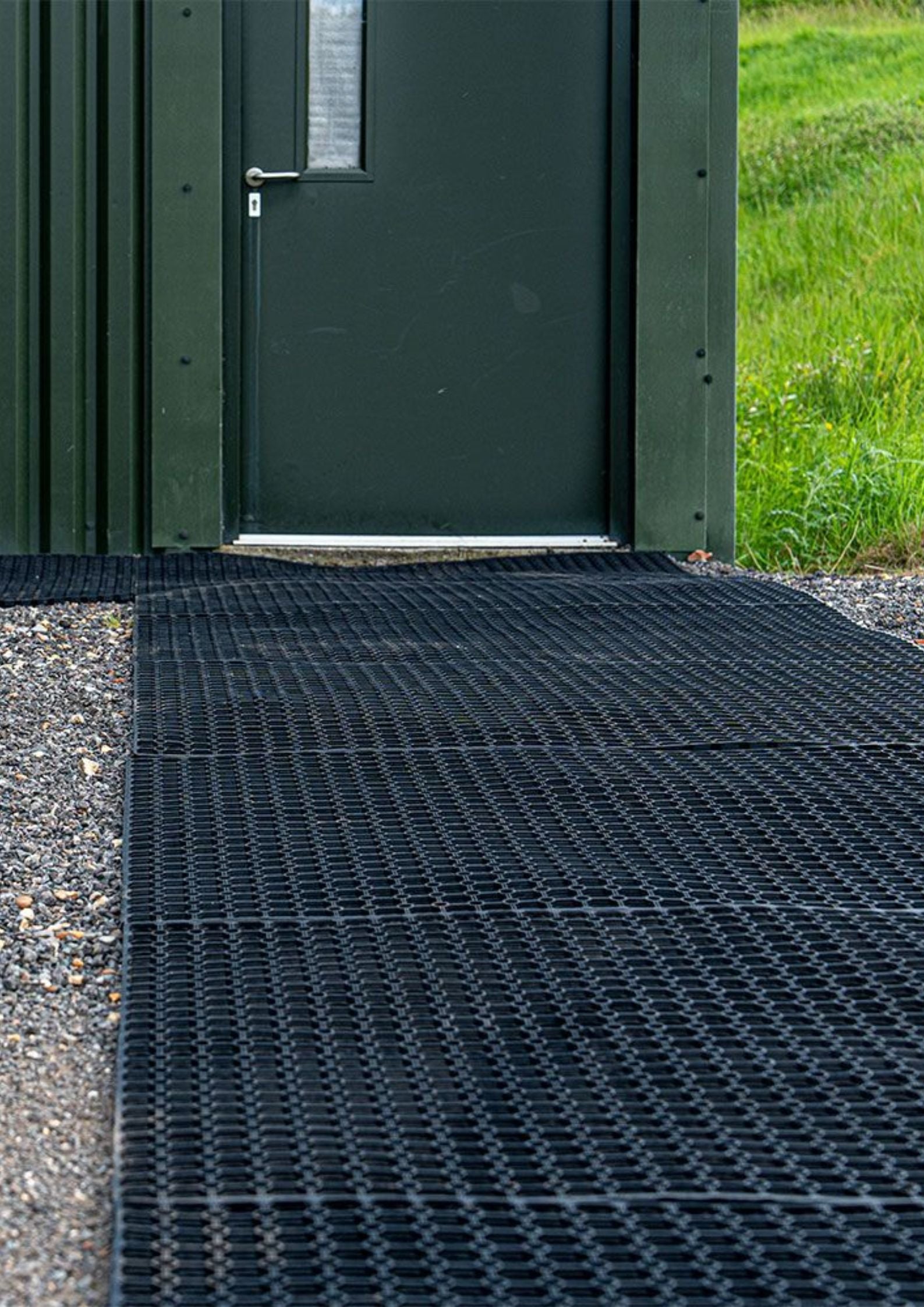 Heavy footfall from people, horses, and livestock quickly turns gateways, feeding points, and stable entrances into muddy, uneven patches that are difficult and often unsafe to walk across. Ground-Stabiliser Mud Mat Tiles help prevent this by spreading weight over a larger area, stopping the ground from churning up and providing a firm, stable surface underfoot. The hole pattern allows water to drain straight through, preventing puddling and helping the surface stay usable in all weather.