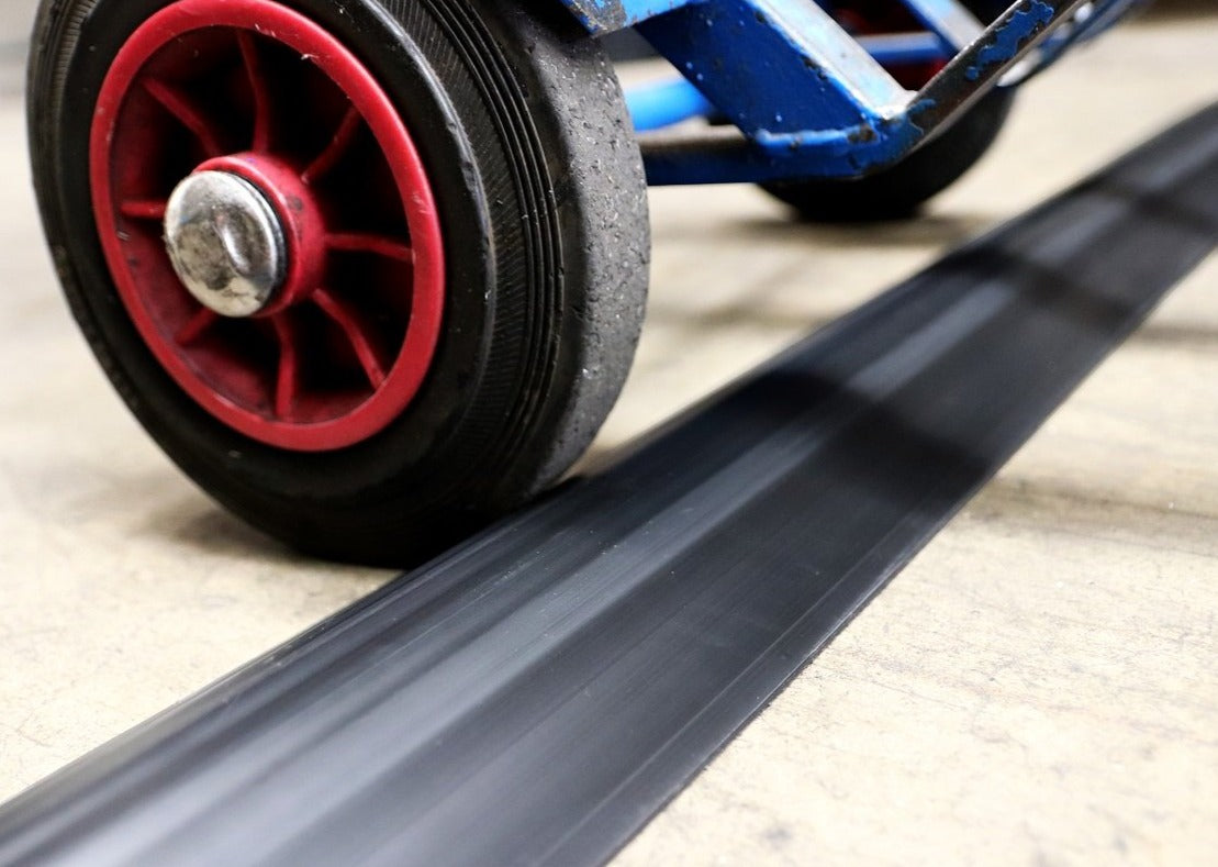 A tough, high-capacity cable protector designed for wheeled traffic in warehouses and factories.