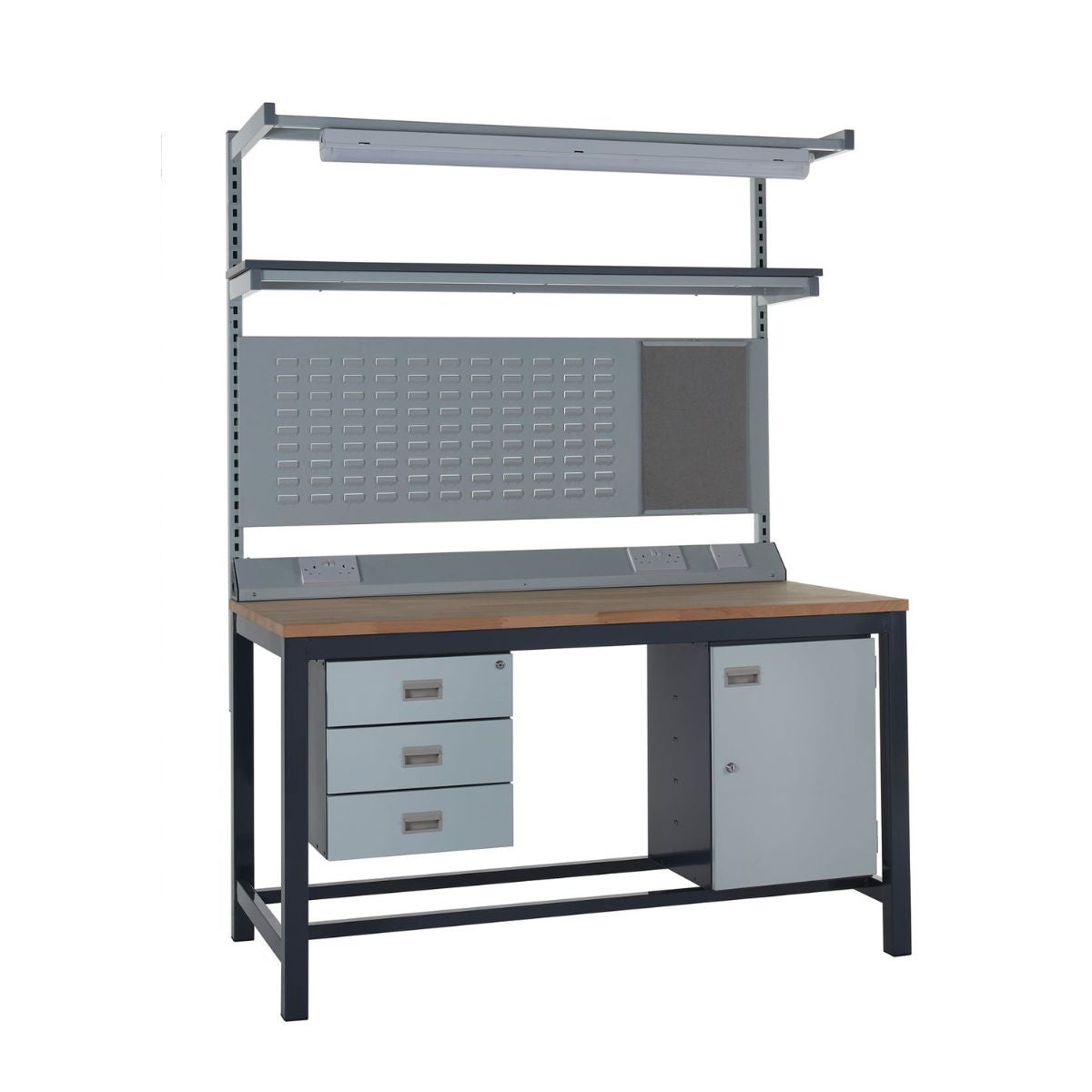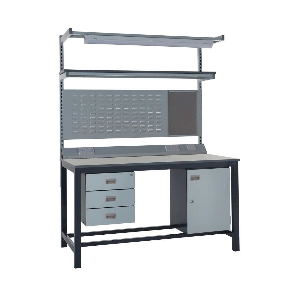 Built for industrial and manufacturing settings, this workbench combines durability with functionality. Its steel frame provides stability, while the 20mm laminate worktop offers a reliable working surface. The integrated worktop service duct with sockets and a 40W LED light improves workspace efficiency. Additional features, including a 3-drawer unit, cupboard, tool rack, louvre panel, and extra shelf, ensure tools and materials are stored securely and within reach.