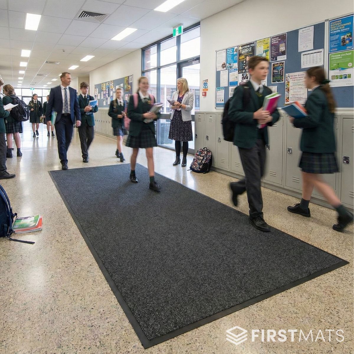 With a plush 10mm-thick surface, it’s highly absorbent, trapping dirt and moisture to keep floors clean and safe in all seasons. The heavy-duty commercial-grade construction is designed for high-traffic use, making it ideal for busy school entrances and reception areas.