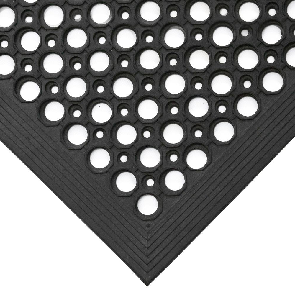 Constructed from durable natural rubber with a 13mm thickness, this mat is rated 5/5 for wear resistance and meets EN 13552 Cat R10 slip resistance standards. The hole pattern design improves drainage and scrapes away debris. Available in various sizes. Temperature resistant from -20°C to +130°C.