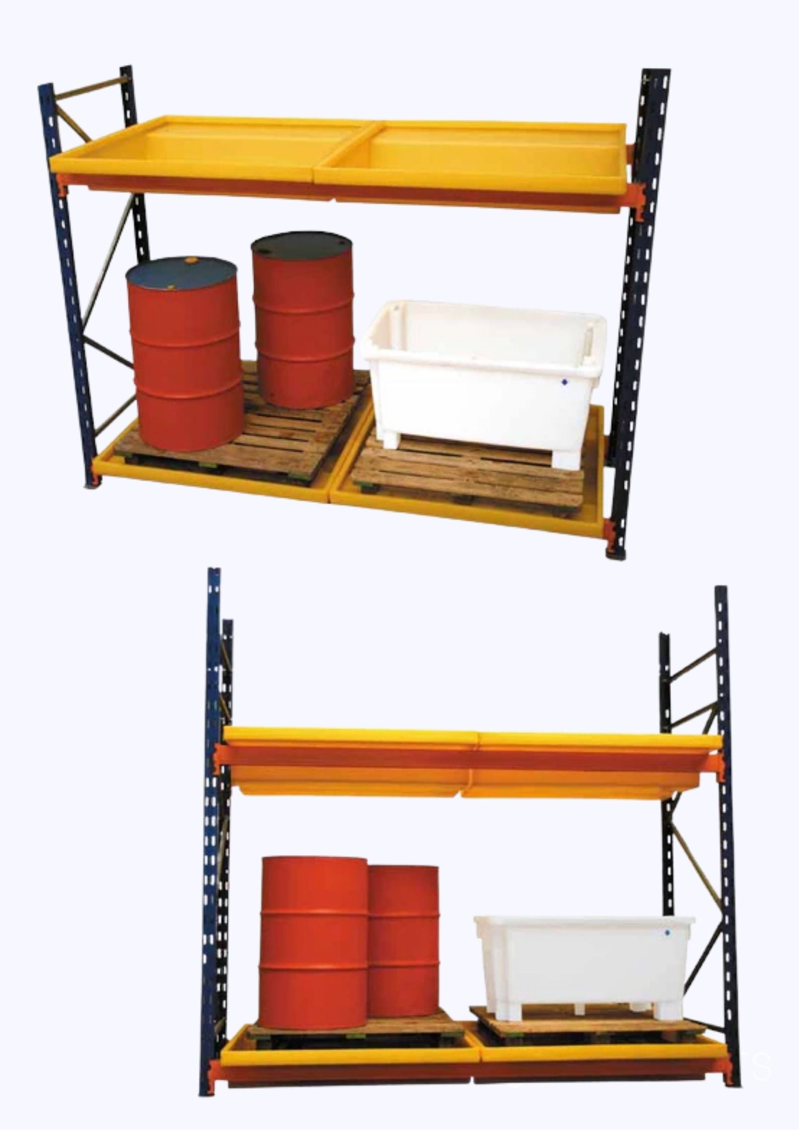- Racking Bunded Pallet - 220-Litre Sump: This robust and reliable solution is perfect for storing oil and fuel drums safely within a standard racking bay.