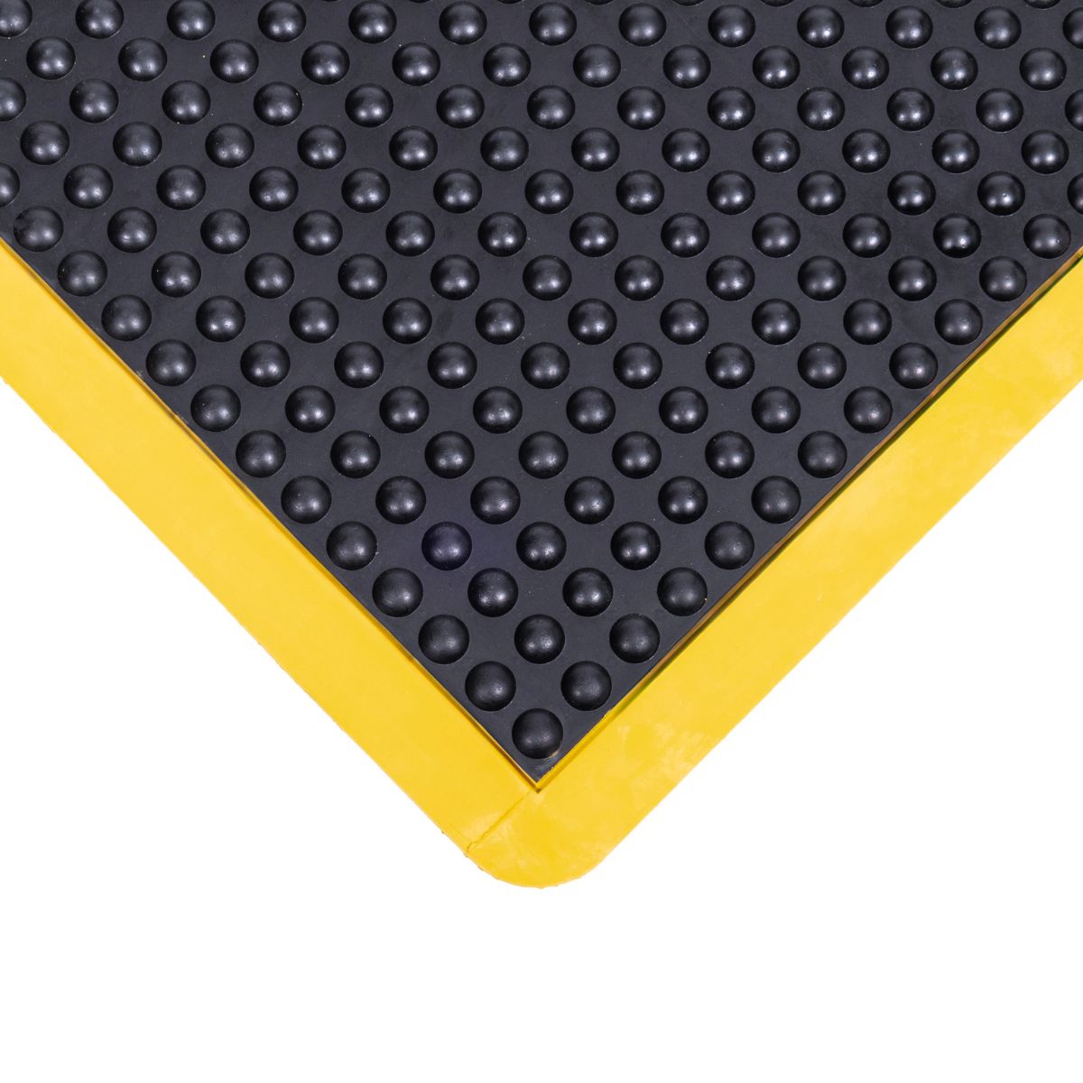 Standing for hours at a checkout, counter, or coffee bar can quickly lead to aching legs, sore feet, and reduced focus, especially on hard floors. The Rubber Bubble Standing Floor Mat tackles these problems with its raised bubble surface, which cushions every step and helps improve circulation. Made from tough natural rubber, it resists daily wear and splashes, while its slip-resistant surface provides added safety in busy, high-traffic areas. Choose plain black for a sleek look, or opt for the yellow safety border for maximum visibility.