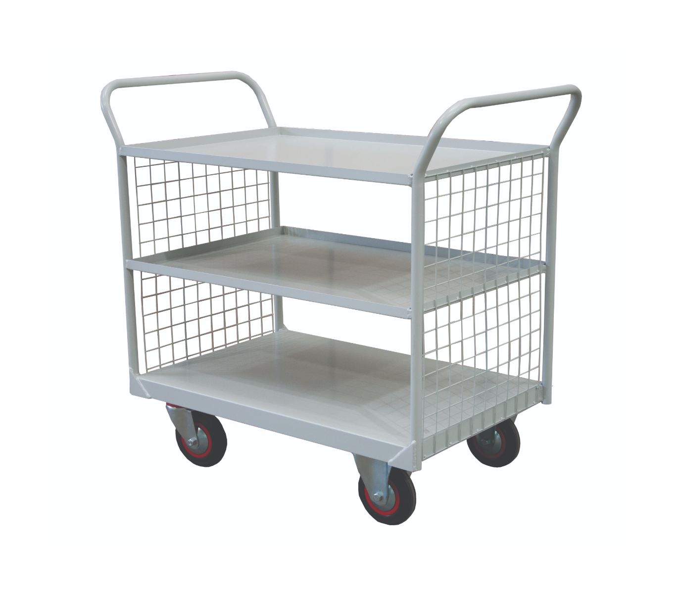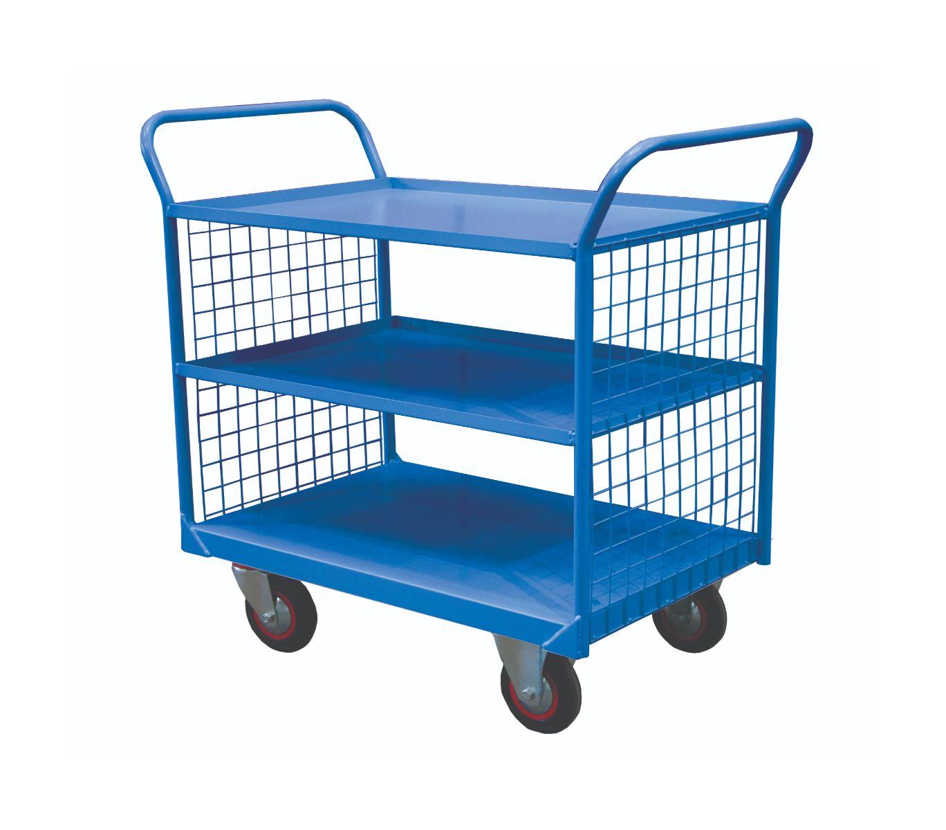 - Welded Steel 3-Tier Shelf Trolley with Mesh Ends: A robust and reliable solution for heavy-duty use in warehouses, workshops, factories and other industrial settings.