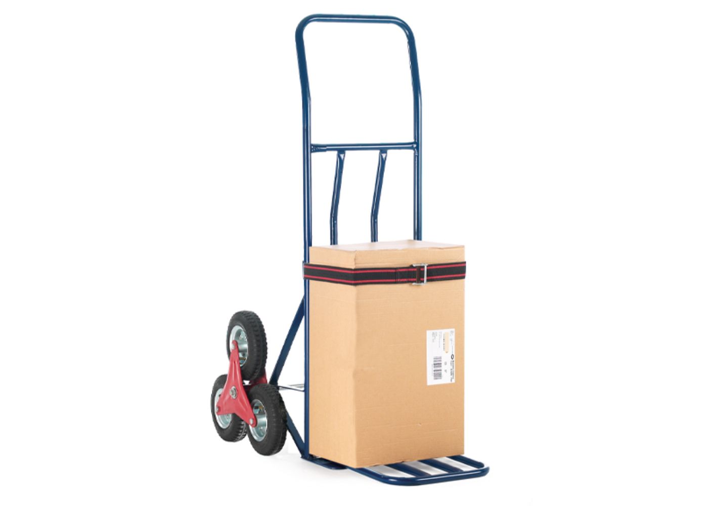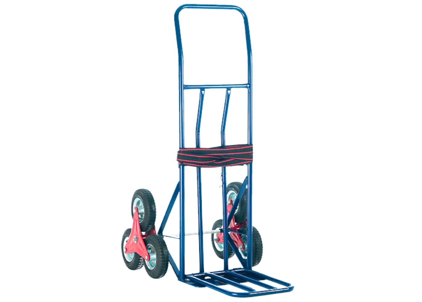 A heavy-duty stair climber sack truck with a secure strap and durable wheels.